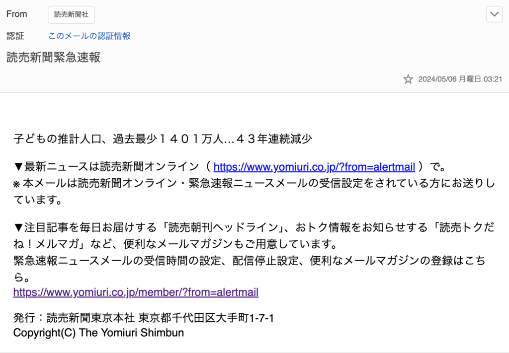 このメールは読売新聞をかたるフィッシングメールの可能性が高いです。
