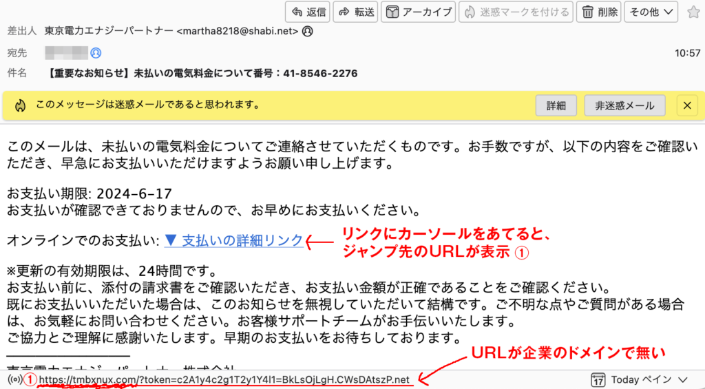 粗雑なフィッシング詐欺であれば、ここを確認すれば、大抵は本物か偽物が判別することが出来ます。